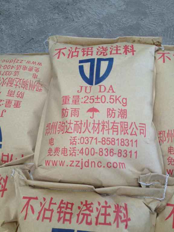 駒達耐材所研發的大型熔鋁爐專用不粘鋁澆注料是專門針對國內熔鋁行業而設計的鋁合金熔煉用澆注料。此澆注料能顯著提高熔鋁合金爐的使用壽命,在鋁熔煉過程中不產生鋁灰,不結剛玉瘤,防止金屬鋁溶液于耐火材料中的元素發生反應,從而避免雜質進入鋁合金中影響鋁合金質量。降低鋁液的附著率,提高防滲能力。目前國內熔鋁爐所用耐火材料均于鋁液反應,在熔煉過程中生成大量的鋁灰,造成了鋁工業的浪費,而且使用壽命短,鋁液還會和耐火材料發生反應,生成雜質而進入鋁液中,污染鋁水的純度,直接影響了鋁合金的性能。而不粘鋁澆注料不僅有不產生鋁灰,能節省鋁錠,不向鋁水中掉落雜質,清潔鋁液的功能,而且使用壽命極長。
