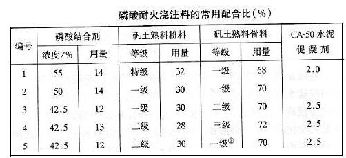 磷酸鹽耐火澆注料一般用粘土熟料或礬土骨料熟料作耐火骨料和粉料,其用量分別為65%~74%和24%~35%。常用配合比(見下表)。耐火骨料為粒徑小于15mm的統料,顆粒級配測定為15~5mm 50%,5~2.5mm 24%,小于2.5mm 26%。耐火粉料細度為小于0.09mm的大于80%。促凝劑為CA-50水泥,其用量視施工條件和常溫強度要求而定。一般用量為2%左右,環境溫度較低時,應適當增加用量,不要求常溫強度時可不加或少加CA-50水泥。