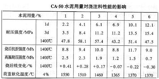 黏土耐火澆注料用的促凝劑,其品種和用量對性能的影響,對于常溫耐壓強(qiáng)度和1400℃高溫耐壓強(qiáng)度來說,CA-70水泥的作用效果 比CA-50水泥的好,但成本增加較大:隨著促凝劑用量的增加,3d常溫耐壓強(qiáng)度不斷提高,1400℃高溫耐壓強(qiáng)度則不斷下降。(下表二)為CA-50水泥用量對澆注料性能的影響。從表中看出,隨著CA-50水泥促凝劑的不斷增加,常溫耐壓強(qiáng)度提高,1400℃高溫耐壓強(qiáng)度和變形4%的荷重軟化溫度則不斷降低,1400℃燒后線變化由膨脹磚為收縮,1400℃燒后耐壓強(qiáng)度變化無規(guī)律。