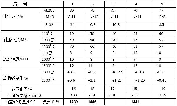 微粉結合鋁鎂尖晶石質耐火澆注料用的耐火骨料,主要是山西特級礬土熟料,AL2O3與TiO2合量約為90%,臨界粒徑約為25mm,一般采用連續顆粒級配,也有用間斷級配的:結合劑為活性SiO2超微粉,SiO2大于91%,中直徑D5O約為3μm,另加聚磷酸鈉等分散劑和快干劑。其性能見(下表)。基質中均加較高檔次的鋁鎂尖晶石粉、剛玉粉和α-AL2O3超微粉。表中編號1添加電熔鎂砂粉,用量約為9%:編號2添加高純鎂砂粉,編號4添加MgO約為94%的燒結鎂砂粉,編號3、編號5和編號6則為中檔鎂砂粉。其細度均不大于0.088mm。