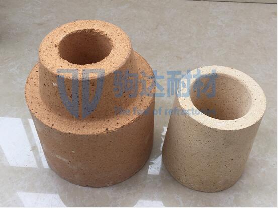 鑄口磚也叫水口磚,水口磚鑲嵌在盛鋼桶底部座磚中的耐火材料,鋼水流出口。不澆注時水口磚和塞頭磚呈線接觸,保證不漏鋼。水口磚上口是弧面形,便于開啟、關(guān)閉水口及減小鋼水流動的阻力,下段是直線段以穩(wěn)定注流。其材質(zhì)與塞頭磚相近,可采用粘土質(zhì)、高鋁質(zhì)、鎂質(zhì)、鎂鉻質(zhì)及鋯質(zhì)的。澆注沸騰鋼及高錳鋼時黏土質(zhì)的水口易被侵蝕,故采用鎂質(zhì)或高鋁質(zhì)水口磚。鎂質(zhì)水口耐侵蝕性強(qiáng)但導(dǎo)熱性也強(qiáng),澆注中易產(chǎn)生結(jié)瘤。