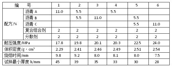 從表中看出,在鎂砂為85%、復合結合劑和分散劑分別為2%時,隨著瀝青軟化溫度的降低,補爐料的體積密度和耐壓強度逐漸增加,燒結時間縮短,鋪展性增大。這些特性對補爐料是有利的:試樣最小厚度也隨瀝青軟化溫度的降低而減小,這是不利的。因為該尺寸大即補料層厚,有利于抗熔渣侵蝕和提高使用壽命,如編號1。編號1的其他性能不好,也影響使用:編號6的其他性能好,但其最小厚度小,也是不利的。同時,軟化溫度低的瀝青,能較快的熔化并迅速形成致密炭化映客,阻礙了內部瀝青揮發分的排除。該瀝青揮發分比較多,排除不暢,使補爐料形成夾層或貫通氣孔,將嚴重影響使用。綜合而言,編號4和編號5的補爐料較好。如果不考慮氣孔和夾層的影響,應盡量采用軟化溫度低的瀝青做結合劑,配制新型補爐料。