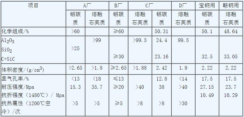 表1 長水口用耐火材料