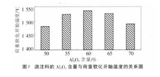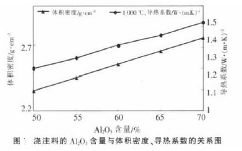 以特級、二級及三級高鋁熟料及焦寶石為主要材料,加入硅微粉,以鋁酸鈣水泥為結合劑,以磷酸鹽為減水劑。固定硅微粉、水泥及磷酸鹽減水劑的加入量,測試澆注料的不同氧化鋁含量與荷重軟化開始溫度、體積密度、導熱系數的關系。(見下圖1)由下圖可知,隨著低水泥澆注料氧化鋁含量的提高,澆注料的體積密度增大,導熱系數提高。(由圖2)可知,低水泥澆注料的氧化鋁含量在60%左右時澆注料的荷重軟化開始溫度較高,可選擇在軋鋼加熱爐高溫段使用,從性價比來考慮,氧化鋁含量在50%的澆注料可選擇在軋鋼加熱爐的低溫段使用可達到有效的節能目的。