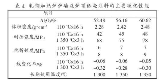 軋鋼加熱爐的預熱段工作溫度一般在1200℃以下,采用氧化鋁含量為50%~55%左右的低水泥澆注料完全可滿足使用需求。加熱段及均熱段工作溫度一般在1350℃左右,可選擇氧化鋁含量為60%左右的低水泥澆注料,該澆注料細粉應選擇雜質含量較低的原材料,以提高澆注料的高溫使用性能。爐墻及爐頂澆注料主要理化指標見(下表4)