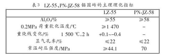 采用不定型耐火澆注料作為工作襯里的軋鋼加熱爐,錨固磚的選擇較為關鍵,因為錨固磚對整個加熱爐襯里的結構起著重要的作用,按照高鋁磚指標區分錨固磚可以分為LZ-75、LZ-65、LZ-55、LZ-48四種,LZ-75、LZ-65的錨固磚的導熱系數、熱膨脹率及成本較LZ-55的錨固磚高,在軋鋼加熱爐上一般部位,LZ-55錨固磚完全可滿足使用需要。而在水粱及壓下部位,一般選用振動成型的PN-JZ-58的錨固磚。因為振動成型的錨固磚臨界粒度較大,材料的結合強度較高,錨固磚的抗拉強度也較機壓成型的高,并且通過國內眾多軋鋼家加熱爐的使用證明(下表3)為LZ-55、PN-JZ-58錨固磚的主要理化指標。