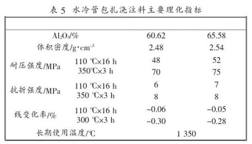 水冷管包扎用澆注料其施工厚度一般在50~60mm左右。通常情況下,水冷管包扎用澆注料每座加熱爐只選擇一種,一般選擇氧化鋁含量為60%~65%的低水泥澆注料可滿足使用要求,但必須選擇流動性能較好的澆注料。(下圖5)為水冷管包扎澆注料主要理化指標。