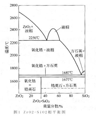 由圖1看出,ZrO2加入硅質材料中,對其溶化溫度降低 的影響非常有限,而且ZrO2 . SiO2在1677℃分解為ZrO2和SiO2,前者以微粒狀態存在于玻璃相中,有利于提高其黏度和抗 蝕性能,同時提高材料的高溫塑性,提高抗熱震性,從而延長 使用壽命。