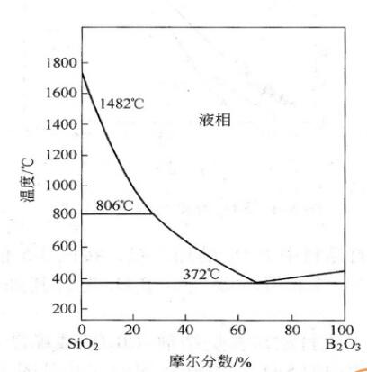 由SiO2-B2O二元系相圖(下圖)可知,B2O的熔點 為450℃,SiO2-B203系最低共熔溫度為327℃。當向SiO2中 補入不超過5%的B203時,SiO2-B2O混合料的熔化溫度由 SiO2熔點(1723℃)下降到1480℃.該圖還表明,以B2O作為石英質干式打結料的燒結劑時,在372℃就會出現液 相。