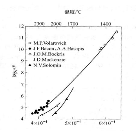 雖然B2O對SiO2熔化溫度的影響極為明顯,但由于石英玻 璃的黏度很大(見下圖,在1730℃時約為2xl06Pa.s),而B2O本身亦為玻璃網絡結構形成物,所以少量B2O加進SiO2材料中不會造成SiO2玻璃網絡結構產生大的破壞而影響SiO2熔 體的黏度。這表明,硅質干式打結料采用B2O作燒結劑時,既 能使感應爐內襯工作表面在較低溫度下燒結,又能保證在高溫 使用時工作表面為一高黏滯層。這種工作表面能阻止金屬熔體和熔渣的滲透、沖刷和侵蝕。