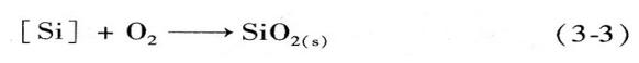 反應平衡溫度T=1467℃。這說明,當熔煉溫度超過Te時,感應爐內襯中的SiO2會被[C]還原,導致內襯變質、損毀。相反,當熔煉溫度低于Te時,爐料中混入的Si和鐵液中[Si]則會與O2反應: