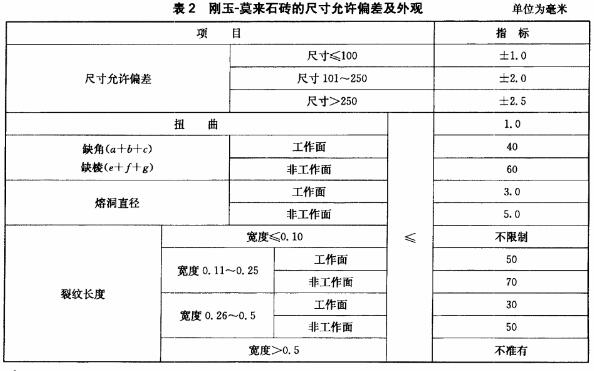 磚的理化指標(biāo)應(yīng)符合表1的規(guī)定。磚的尺寸允許偏差及外觀應(yīng)符合表2的規(guī)定,預(yù)組裝的產(chǎn)品尺寸允許偏差應(yīng)符合表3的規(guī)定。