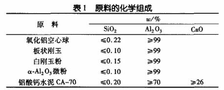 1.1本實驗中選用臨界度為3mm的氧化鋁空心球、板狀剛玉(≤3mm)、白剛玉粉(≤0.045mm)、α-AL2O3微粉(d50=5μm)、鋁酸鈣水泥CA-70等為主要原料。主要原料的化學組成見表1