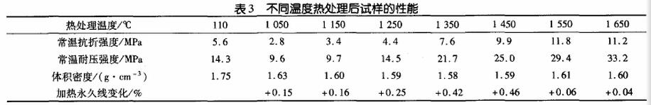 按照表2配料,并按試驗獲得的最佳加水量9.7%~10%加水攪拌,振動城行為40mmX40mmX160mm的樣條,自然養護12h后拆模,在110℃干燥24h,然后分別在1050、1150、1250、1350、1450、1550、和1650℃、熱處理3h。按常規標準方法檢測不同條件下處理后試樣的常溫抗折強度、常溫耐壓強度、體積密度、加熱永久線變化,結果見表3