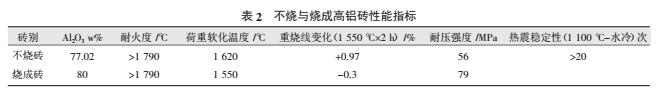 一般不燒制品采用多級顆粒配料,選用適當?shù)挠袡C與無機結合劑、添加劑,其制品的體積密度、氣孔率、抗侵蝕性和抗?jié)B透性等普遍好于燒成制品。特別是不燒磚借助使用環(huán)境中的熱能達到適當燒結,形成具有梯度特征的結構,以及主體材料與添加物熱膨脹系數(shù)不一致的特性,是不燒磚在使用條件下產(chǎn)生足夠多的微細裂紋,且裂紋以準靜態(tài)方式擴展,從而提高不燒磚的抗熱震穩(wěn)定性,(表2)是不燒高荷軟高鋁磚與長期使用的燒成高鋁磚性能對比。不燒磚的使用壽命比燒成磚提高1倍,由于熱震性好,使用中不掉塊。