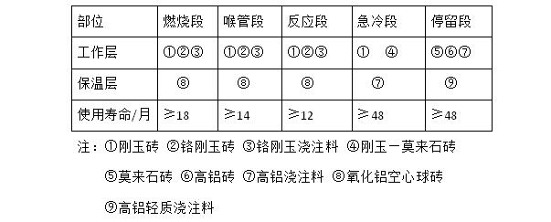 1分別列出了當前炭黑反應爐不同部位內(nèi)襯材料的選擇、使用壽命和材料性能。