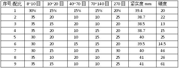 取每一種配比的石英砂300克,混合均勻,倒于抗壓試樣樣筒內。然后,在制樣機上準確的錘擊5次,記錄緊實度的大小,取出樣筒,在其底部測量硬度。記錄備考。在所有記錄中選取緊實度最大者。