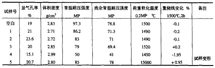 試樣制作原料以山西特級礬土熟料、本地結合粘土等為主要原料,臨界粒度選擇5mm。有機結合劑選用1.18g/cm³的木質磺酸鈣水溶液,將試樣制備成磚坯尺寸為標準磚230*114*65(mm)在620噸壓力機上壓制成型然后再在高溫隧道窯經1480℃,保溫10小時燒結。試樣理化性能檢測結果,如下表所示