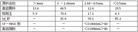 根據(jù)鐵水溝對(duì)耐火材料的要求,高鋁碳化硅磚應(yīng)具有良好的熱震穩(wěn)定性、抗鐵水沖砂及耐侵蝕性。約80%以上的磚單重都超過(guò)50Kg,故此應(yīng)適當(dāng)擴(kuò)大顆粒的極限尺寸。這對(duì)磚的熱穩(wěn)定性,耐沖砂和抗侵蝕性都是有益的。配料的顆粒極限尺寸為4mm,各種原料的顆粒組成見(jiàn)下表: