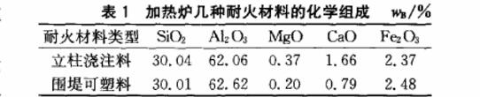 步進式加熱爐在生產過程中經常會遇到粘渣的情況,沒生產一定時間后就要進行清理粘渣、檢修,耗時長、成本高。為了分析產生問題的原因,了解耐火材料的性能,對不同加熱爐內使用的耐火材料情況進行了調查,分析了各部位爐襯材料的性能,并相應制定了企業標準,加以改進。