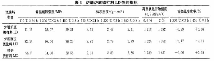 爐墻出現變形,中間縮窄,底部變寬,容易出現開裂:爐底出現大量的氧化鐵渣堆積,影響生產。其所用澆注料、搗打料的性能如表3.