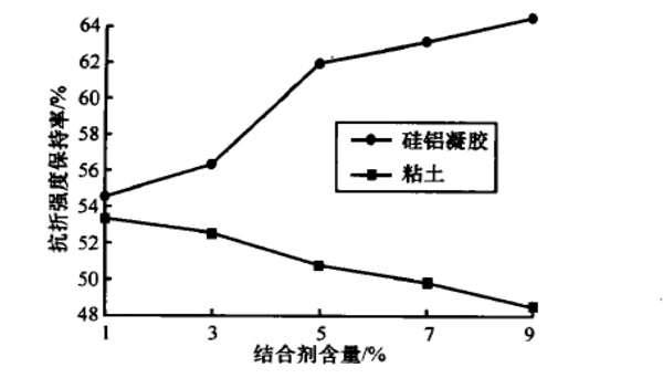 本試驗中,顆粒與細粉的比例為60:40,其中細粉中莫來石與剛玉的質量比為一定值,該值是根據分析國外產品及實際情況決定的。粗顆粒中莫來石與剛玉的比例對窯具性能有很大影響。科研人員曾對剛玉—莫來石系的高溫力學性能做過研究,提出了此兩晶相結合具有最佳力學性能的比例為75:2525:75,并指出這是由于兩晶相在此比例下,晶體相互交織充填的結果。因此,選著莫來石與剛玉顆粒質量比為3:1進行了試驗,同時為了對比,骨料全部選擇為莫來石或剛玉質量比為3:1的試樣1100= 水冷3次后的抗折強度保持率最高,與顆粒料全部采用莫來石顆粒或剛玉顆粒相比,抗折強度保持率分別提高率25%35%。顆粒料中莫來石與剛玉的質量比為3:1時,采用硅鋁凝膠取代粘土作為結合劑,考察結合劑的種類及含量對復相陶瓷力學性能和抗熱震性能的影響。一般在窯具生產中加入粘土有兩個目的:一是增加混合料的塑性,提高成型坯體的結合強度:二是在燒結過程中起到助燒結作用,粘土在高溫下分解形成莫來石,可起到晶核的作用,有助于莫來石的生成,同時,分解生成的SiO2具有很高的活性,也有助于形成莫來石。然而,一般粘土的純度不是特別高,其中含較多的堿金屬氧化物等,在燒成過程中已形成玻璃相,嚴重影響窯具的高溫力學性能和熱震穩定性。結合劑對剛玉—莫來石質推板熱震穩定性的影響見圖1.