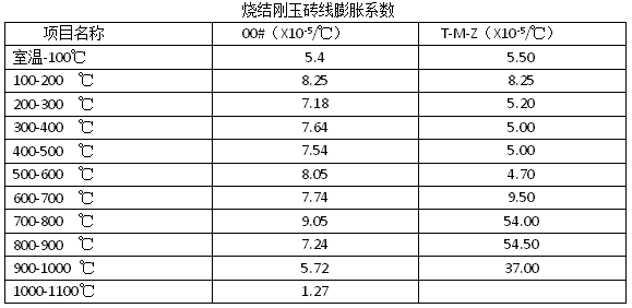 2.00# 燒結剛玉磚熱膨脹系數與溫度之間呈直線關系,在砌筑時僅考慮 0.8~1.0%的線膨脹率。T-M-Z燒結剛玉磚的線膨脹系數與溫度之間的關系不很硅鋁,在700~800℃,800~900℃、900~1000℃之間有突然膨脹現象,但其最大線膨脹率在1.086%,烤窯時應注意。