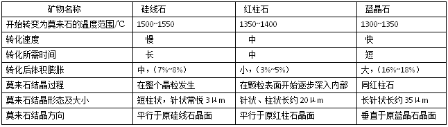 “三石”礦物的最重要性質(zhì)是它們的熱膨脹性能,由于物理化學(xué)性質(zhì)(包括結(jié)晶構(gòu)造和密度等)的不同,加熱時(shí)均產(chǎn)生一定的體積膨脹,藍(lán)晶石的膨脹最大,硅線(xiàn)石次之,紅柱石最小。他們的一些基本特性列于下表