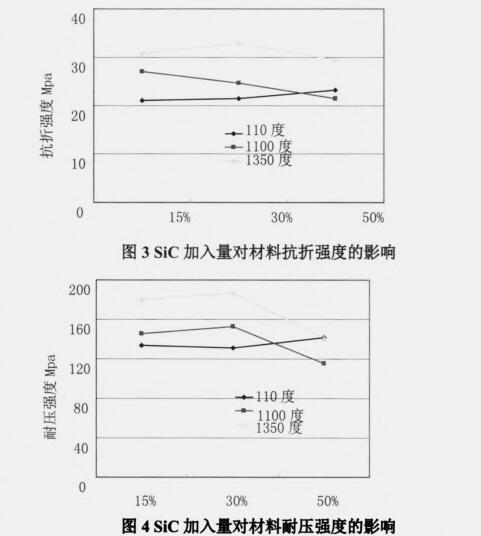從圖l可以看出,對于這三組材料,體積變化呈現(xiàn)兩個特點:一、SiC含量越大,體積密度越大。這主要是由于SiC體積密度為2.6~2.8/cm3,廢舊瓷片的密度大約為2.2~2.49/cm3,因此SiC含量越多,材料體積密度越大。二、隨著溫度的升高,體積密度逐漸減小,這主要是因為材料在溫度升高的過程中逐漸排除游離水和結(jié)晶水,材料體積密度變小。110℃~1100℃過程中,三組材料的體積密度變化不大,但C組分澆注料在1350℃體積密度有上升趨勢,主要是由于SiC抗氧化性能較差,一定溫度下發(fā)生下列反應(yīng):