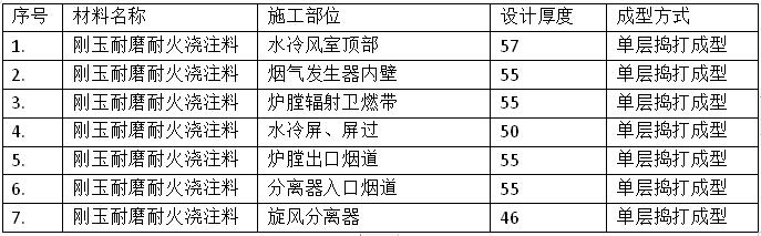 適用區域:主要用在爐膛密相區及汽冷式旋風分離器等部位。此區域耐磨耐火材料設計為單層搗打結構,采用耐磨銷釘固定,其設計厚度較薄,一般在55mm左右,直接敷設在施工面上。耐磨耐火材料具體施工部位和耐磨層厚度見下表