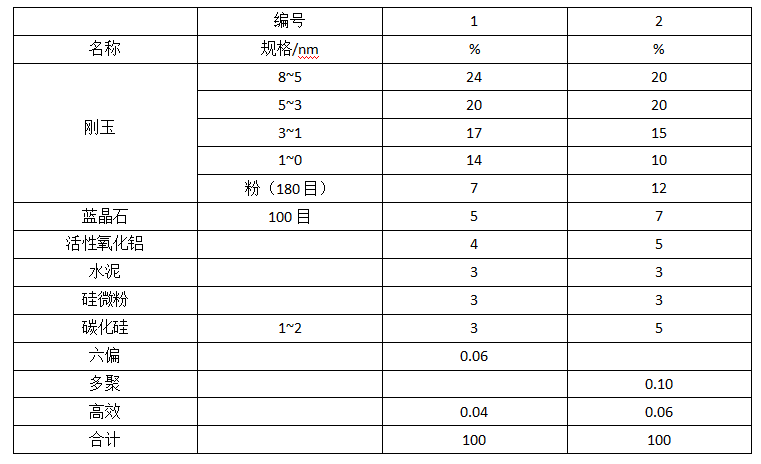 根據(jù)剛玉質(zhì)耐火澆注料的設(shè)計(jì)原理,設(shè)計(jì)2組配比方案。