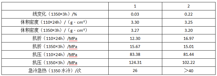 將以上2組材料的熱膨脹性線變化、體積密度、 抗折、抗壓和急冷急熱性能進(jìn)行測(cè)定得以下數(shù)據(jù),見表2。