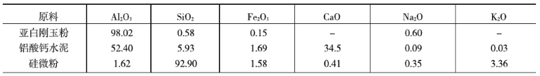 實驗原料研制中選用亞白剛玉顆粒做骨料,采用的是五級粒度級配,即1 mm〜3 mm、3 mm〜5 mm、5 mm〜8 mm、8 mm〜12 mm及細粉,選用鋁酸街水泥作結合劑,并加入純度達98%的碳化硅粉以及外加劑硅微粉,硅微粉的添加,主要是代替并減少水泥的用量。為了減少施工加水量并保證有一定的流動度,滿足施工要求,外加減水劑三聚磷酸鈉,主要原料的化學組成見表1。經優化配方設計,制備試樣。