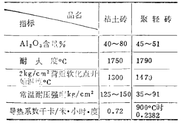 從表1所列兩種材質的理化指標可知,高鋁聚輕磚耐壓強度為35〜91kg/cm2,比粘土磚125〜150kg/cm2差得多,其它指標都高于粘土磚。強度低成高鋁聚輕磚的最大弱點。而焦爐是連續作業,每18小時開關一次爐門,頻繁的開關爐門增加了爐門襯磚的碰撞損壞機會。但焦爐爐門是直立爐門,其襯磚受爐內煤、焦的壓力并不大,故就其強度作為爐門襯磚是足夠的,要注意的是在開關清掃爐門時防止碰撞損傷。