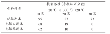 軋鋼加熱爐爐襯澆注料骨料的選擇主要是基于熱震穩定性、高溫性能、導熱性能、成本等方面進行選材。從骨料的熱震穩定性及高溫性能兩個方面分析,骨料應首選電熔莫來石、燒結莫來石、紅柱石等。因為以上幾種原材料在長期使用過程中主晶相是莫來石相,紅柱石骨料在1300℃以上轉變為莫來石相和石英相,石英相可以和基質中的氧化鋁反應生成二次莫來石。另外石英進入液體后,可提高液體的黏度,對提高澆注料的高溫性能起積極的作用。但電熔莫來石、燒結莫來石、紅柱石等骨料的成本相對于高鋁熟料要高,所以骨料中應盡可能少用電熔莫來石、燒結莫來石、紅柱石等材料。電熔白剛玉、電熔棕剛玉、燒結剛玉中骨料應優選燒結剛玉(俗稱板剛玉),因其抗剝落性優于電熔白剛玉和電熔棕剛玉,見表1。但燒結剛玉的成本太高,用于軋鋼加熱爐爐襯澆注料中用戶無法接受另一方面因燒結剛玉的熱膨脹系數和導熱系數均高于莫來石,過多地使用燒結剛玉作為骨料會降低澆注料的熱震穩定性,增加澆注料的導熱率,不利于節能、環保。