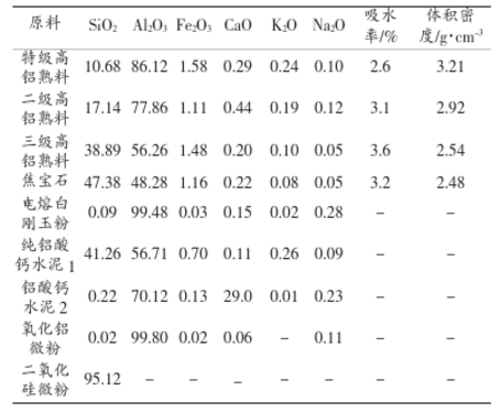 以特級、二級、三級高鋁熟料及焦寶石為主要原材料,加入硅微粉,以鋁酸鈣水泥為結合劑,以磷酸鹽為減水劑。固定硅微粉、水泥及磷酸鹽減水劑的加入量,研究澆注料的不同氧化鋁含量與荷重軟化開始溫度、體積密度、導熱系數的關系。表2為主要原材料的理化指標。