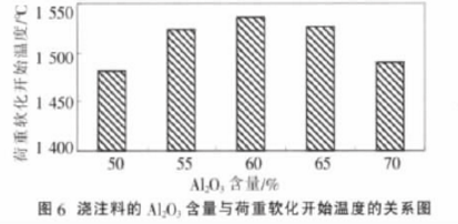 澆注料氧化鋁含量與體積密度、導熱系數的關系見圖5澆注料氧化鋁含量與荷重軟化開始溫度的關系見圖6。荷重軟化開始溫度檢測標準YB/T 370-1995實驗條件為1350℃x3h燒后。