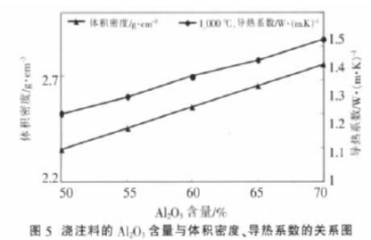 由圖5可知,隨著低水泥澆注料氧化鋁含量的提高,澆注料的體積密度增大,導熱系數提高。由圖6可知,低水泥澆注料的氧化鋁含量在60%左右時,澆注料的荷重軟化開始溫度較高,可選擇在軋鋼加熱爐的高溫段使用,從性價比來考慮,氧化鋁含量在50%的澆注料可選擇在軋鋼加熱爐的低溫段使用可達到有效的節能目的。