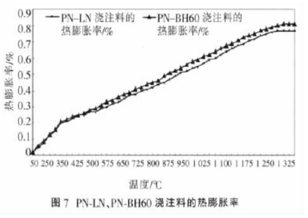 軋鋼加熱爐不定形內襯的膨脹縫數值及分布位置和構造,應由設計規定,膨脹縫數值可按材料線膨脹率大小留。圖7PN-LNPN-BH60澆注料熱膨脹率。熱膨脹率檢測標準YB/T 5205-1993,實驗條件為1350 ℃x3 h燒后。由圖7可知,PN-LN澆注料1000的熱膨脹率為0.60%PN-LN低水泥澆注料1000燒后的永久線變化率一般為-0.20%,所以軋鋼加熱爐預熱段PN-LN低水泥澆注料的膨脹縫留設為:0.60-0.22=0.40%即每m應留4 mm的膨脹縫,每2 m左右留8 mm左右的膨脹縫。PN-BH60澆注料1300的熱膨脹率為0.81%,由表23可知,PN-BH60低水泥澆注料1300燒后的永久線變化率為-0.28%所以軋鋼加熱爐加熱段及均熱段PN-BH60低水泥澆注料的膨脹縫留設為0.81-0.28= 0.53%,即每m應留5.3 mm膨脹縫,每2 m左右留 10.6 mm膨脹縫,但通常膨脹縫。因為在高溫下,材料有液相生成,液相的存在可緩沖材料的膨脹應力,故PN-BH60低水泥澆注料在高溫段一般每2m左右留8 mm的膨脹縫。