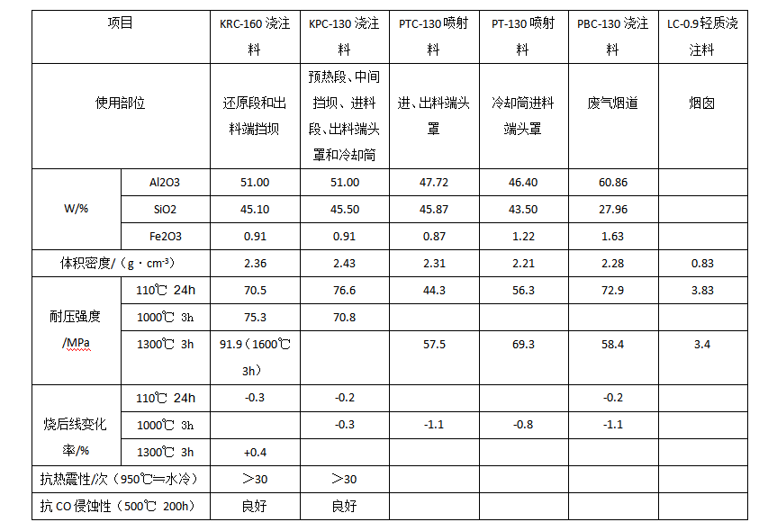 1:直接還原煉鐵回轉窯用澆注料的性能