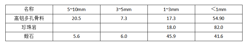 集料的顆粒級配對隔熱耐火澆注料的強度容重和施工時泥料的和易性均有較大的影響,這次試驗的集料顆粒級配參數如表2所示。