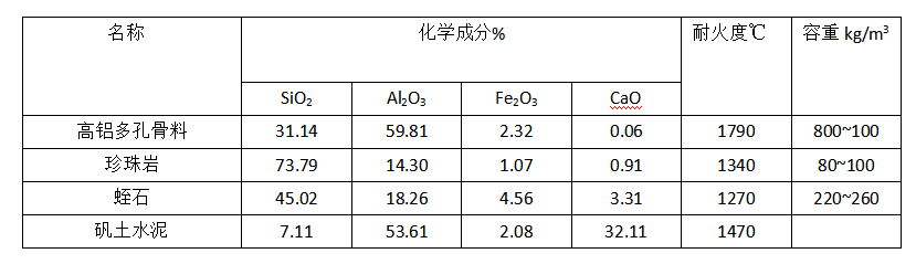 由于步進梁式加熱爐的爐床由活動梁和固定梁組成。活動梁是通過液壓帶動,反復向上、前進、下降和后退,使擺放在固定梁上的料坯連續前進,達到加熱的目的。因而要求澆注料既要質輕、又要強度高。而用于煙道及換熱器的隔熱澆注料則要求具有較小的導熱系數來降低熱量損失、改善惡劣的工作環境,根 據以上要求,這次試驗所使用高鋁輕質多孔料,膨脹珍珠巖和膨脹蛭石為集料,礬土水泥為膠結劑,外加少量摻合料。理化性能參數如表1所示。