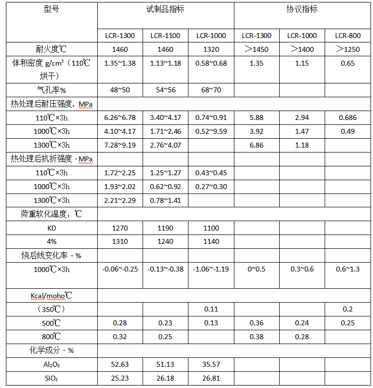 將拌合好的泥料成型為40mmX40mmX160mm的試塊,檢測其線變化、抗折強度、耐壓強度、體積密度、氣孔率。做導熱系數的試樣成型為Φ18OmmX2Omm的試塊。測荷重軟化的試塊尺寸為Φ5OmmX5Omm。澆注料的理化性能指標如表3。