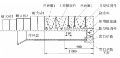 原窯口錨固件為V形錨固件,材質為Cr25Ni20,錨固件的下端直接焊接在窯口筒體上,錨固件底部焊接處接觸面積小;耐熱鋼焊條與窯口擋磚圈2及窯筒體的材質(Q235-C)不符;每3塊窯口護鐵預留一條膨脹縫,膨脹縫設置過少。上述原因造成窯口澆注料發生剝落炸裂的現象,嚴重影響其正常使用壽命。