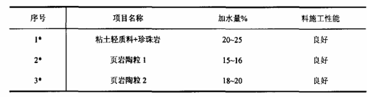 實驗過程選用多孔粘土熟料、頁巖陶粒、珍珠巖和SiO2超細粉等為原料,礬土水泥為結合劑,減水劑選用三聚磷酸鈉、六偏磷酸鈉及有機結合劑等。通過多組配比,進行對比試驗,分別檢驗澆注料的加水量、施工性能,以及不同溫度下的耐壓強度、體積密度和導熱系數等指標,通過對比確定出最佳方案。
