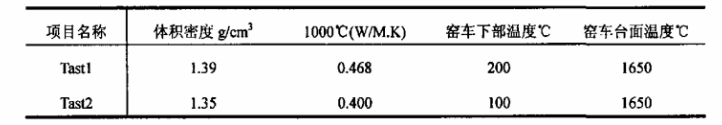 要求輕質澆注料的工作溫度為1200℃,導熱系數小于0.400W/M·K(1000℃)時,窯車下部溫度下降到100℃以下。