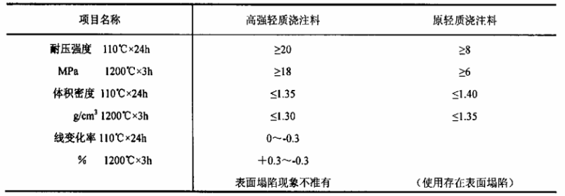 表1 高強輕質澆注料的性能指標
