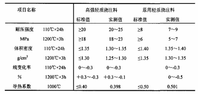 高強輕質澆注料理化指標研制的高強輕質澆注料理化性能與曾試用過的輕質澆注料理化性能進行了對比見表6。