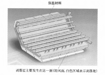 圖8為2011年1月10日檢修時,使用1年后的情況。可以看出局部發生剝落,主要集中在低溫方向這一排(圖中白色粗線所示位置),但是剝落層只有預制件的1/3厚度,對整體效果沒有影響。此問題我們已與通達公司進行溝通,其也給出了指導性意見:① 安裝過程當中嚴格控制每塊預制件之間的間隙在10mm,其中鑲嵌耐磨陶瓷纖維毯,并用火泥進行填塞;②在保溫材料處理過程當中用塑料布把預制件和注料、保溫材料進行隔離,以防止水分進入到預制件中,在升溫過程中影響使用效果。