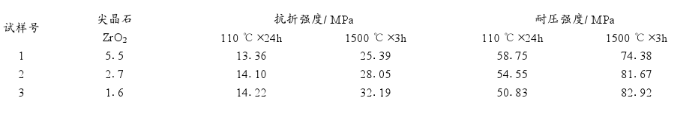 (1)在剛玉-尖晶石澆注料中加入適量的氧化鋯外加劑有補強的作用,可以提高澆注料的耐壓強度、體積密度,降低顯氣孔率。
